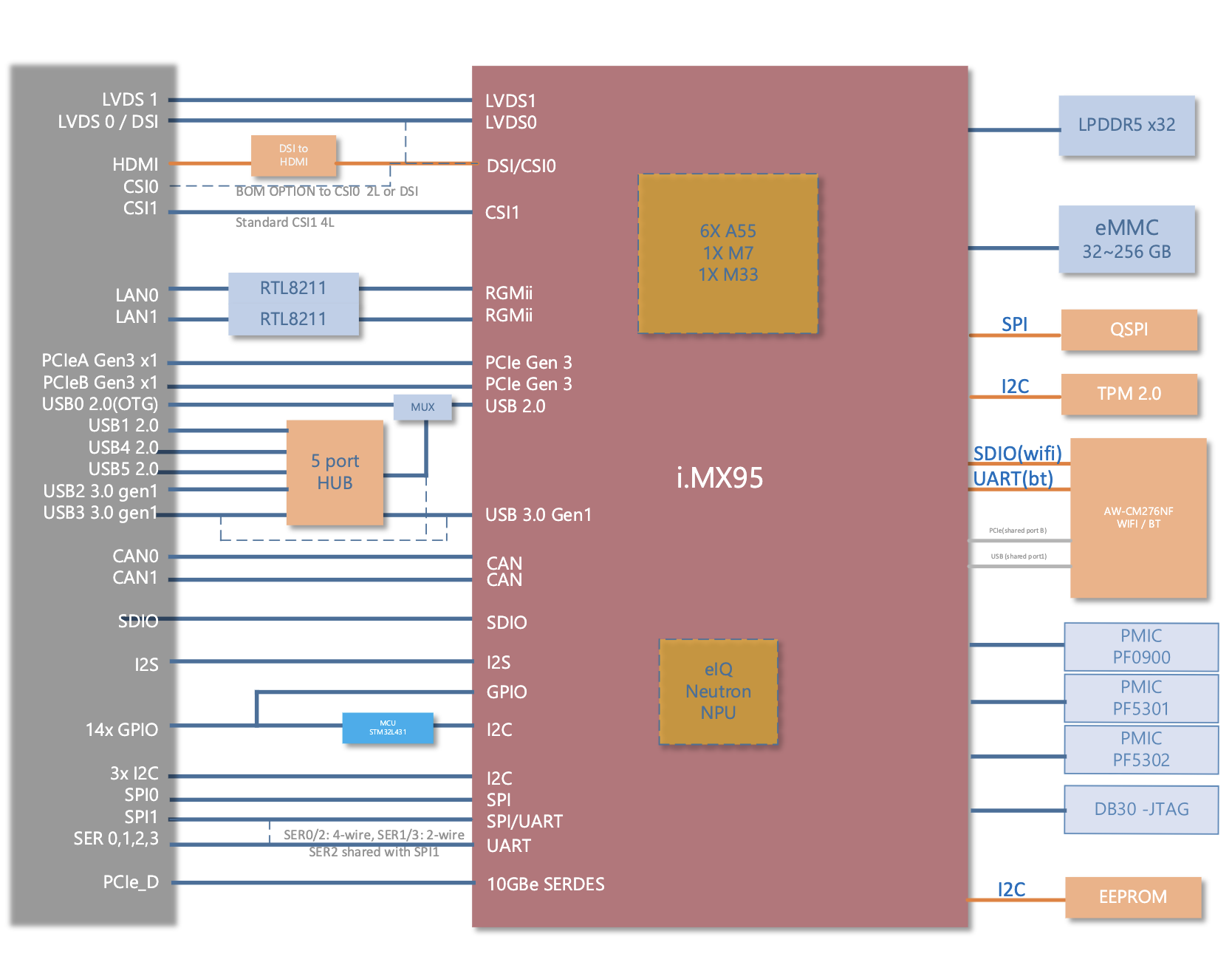Pour rappel, le puissant processeur i.MX 95 de NXP, annoncé officiellement au début 2023 mais réellement disponible depuis quelques mois seulement, est doté de six coeurs Arm Cortex-A55, d’un coeur Arm Cortex-M17 et d’un coeur Arm Cortex-M33 (les deux pour le temps réel), flanqués de 2 à 8 Go de mémoire LPDDR5.