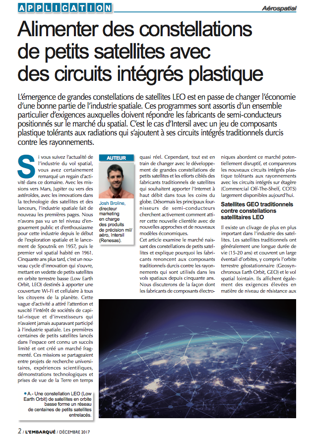 Alimenter des constellations de petits satellites avec des circuits intégrés plastique, par Josh Broline, directeur marketing en charge des produits de précision mil/aéro, Intersil (Renesas), un article à lire au format PDF ici.