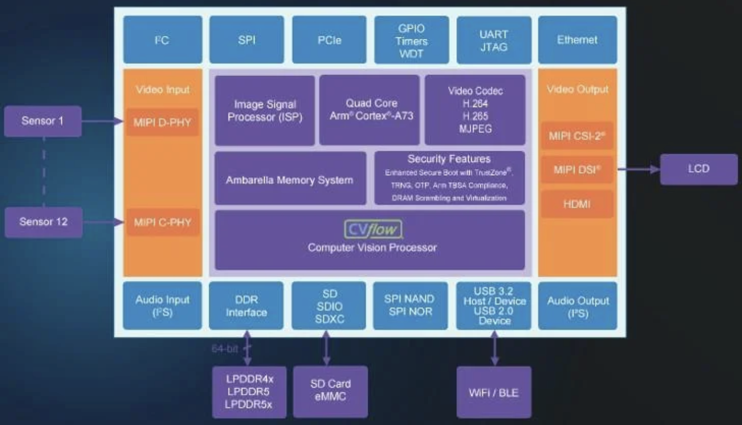 Le CV7 intègre l'accélérateur d'IA propriétaire d'Ambarella et un processeur de signal d'image (ISP) qui supporte une plage dynamique étendue (HDR), la correction de la distorsion pour les caméras fisheye et le filtrage temporel à compensation de mouvement 3D. Le circuit intégre en outre un bloc d'encodage vidéo (H.264, H.265, MJPEG), ainsi que quatre coeurs Arm Cortex-A73, flanqués d’une interface de mémoire Dram 64 bits, des entrées/sorties et d'autres fonctions, afin d'offrir aux utilisateurs une puce-système de vision IA puissante et efficace.