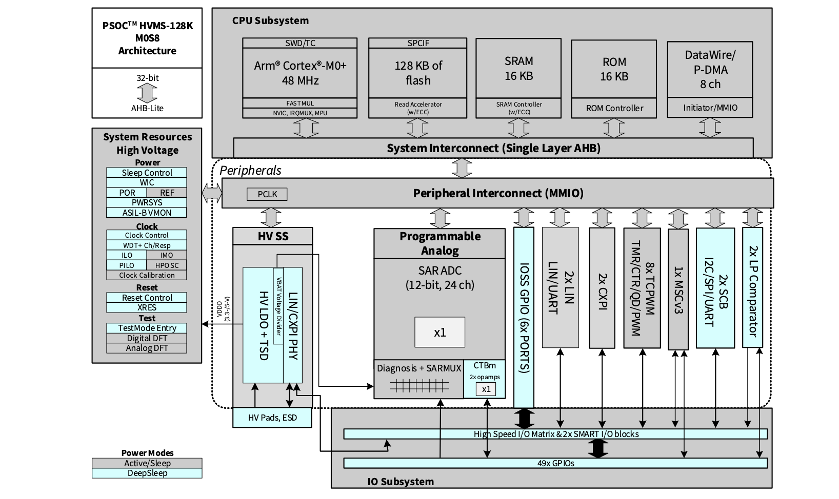 Enfin, notons que la famille des microcontrôleurs PSOC 4 HVMS procure des fonctionnalités analogiques améliorées, notamment un convertisseur analogique-numérique SAR (Successive Approximation Register) sur 12 bits, jusqu'à deux amplificateurs opérationnels et des comparateurs basse consommation.