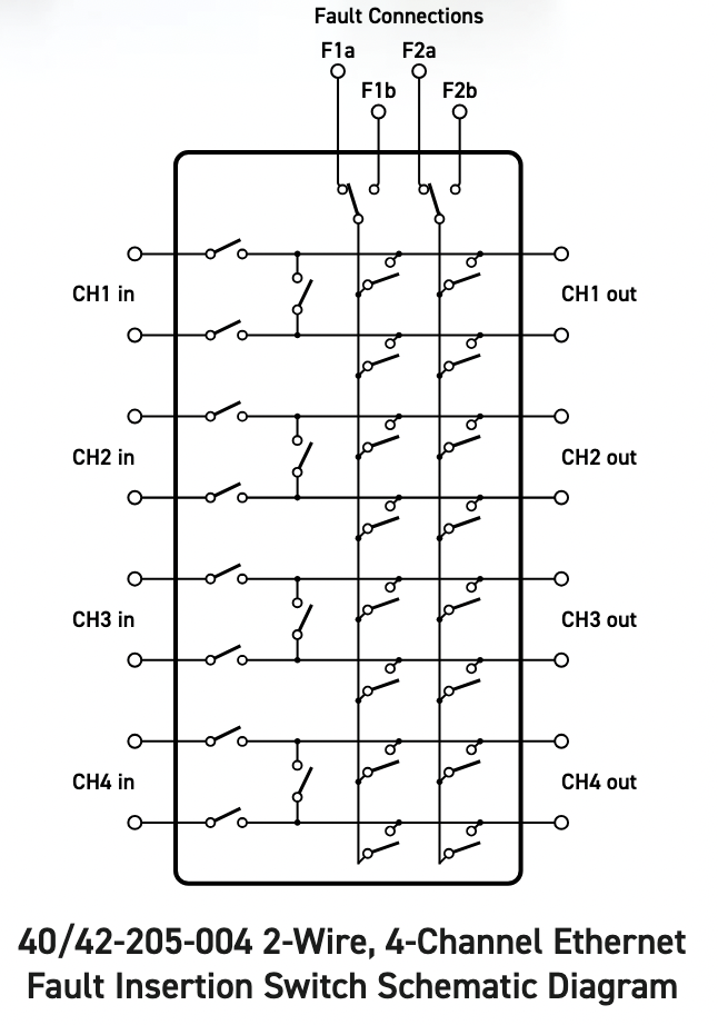 Par défaut, les canaux 2 fils traversent directement le module sans perte de signal significative. Il est également possible de configurer n'importe quel fil en circuit ouvert ou d'appliquer des courts-circuits entre les paires de fils. Les connexions de défaut peuvent également être établies avec l'un des quatre signaux externes à travers deux bus de défaut, chacun doté d'une connectivité de commutation de type EMR, simulant généralement des connexions à la tension d'alimentation/à la terre, ou des défauts résistifs entre les canaux.