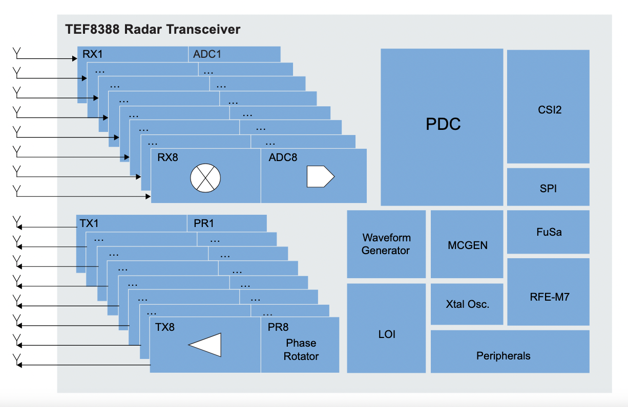 Le composant, référencé TEF8388, intègre sur une seule puce RFCMOS huit canaux d'émission et huit canaux de réception, ouvrant la voie à des configurations de capteurs radar pouvant atteindre plusieurs centaines d'éléments d'antenne virtuelles.