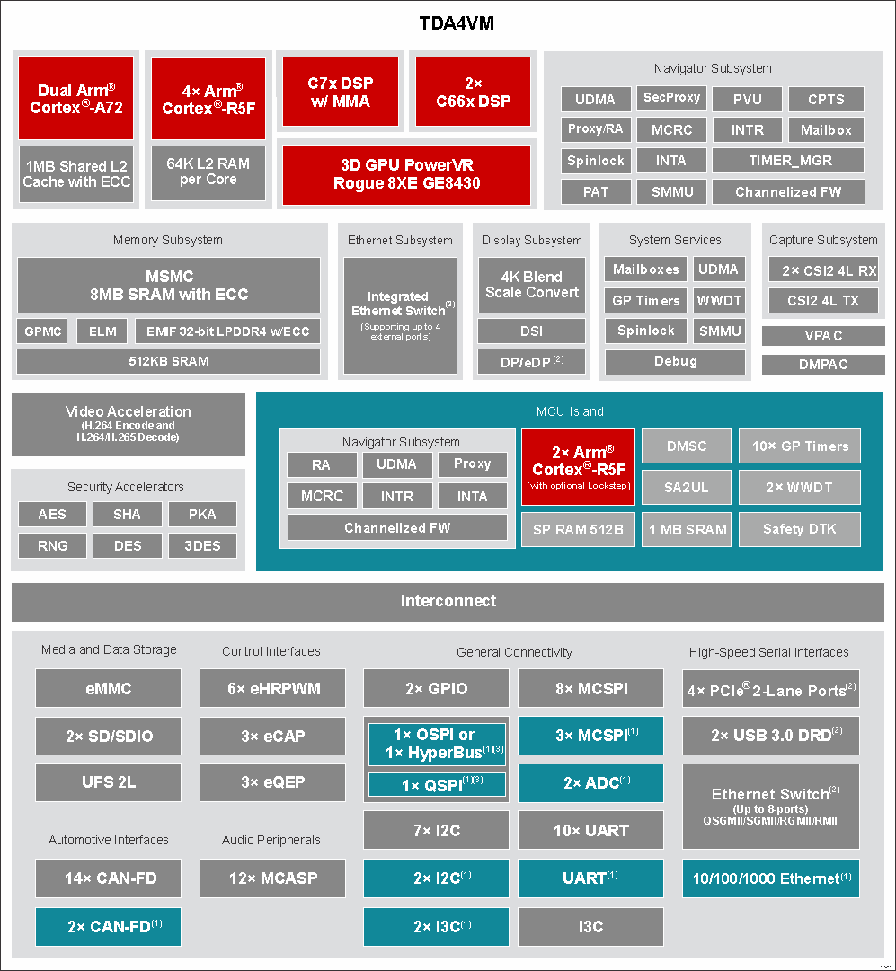 Les deux processeurs intègrent aussi un sous-système de microcontrôleurs Cortex-R5F (MCU Island) assurant la sûreté de fonctionnement. Une approche qui permet aux constructeurs et équipementiers automobiles de prendre en charge aussi bien les tâches Asil-D critiques pour la sécurité que les fonctionnalités de confort via une seule puce, indique Texas Instruments. Les deux composants partagent par ailleurs une même plate-forme logicielle.
