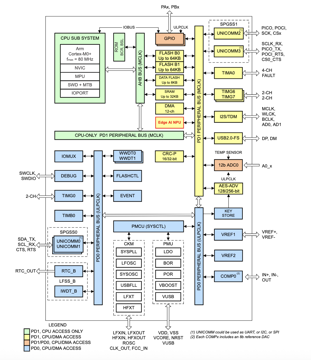 Dans le détail, le premier microcontrôleur annoncé - le MSPM0G5187 (schéma ci-dessous) - est architecturé autour d’un coeur Arm Cortex-M0+ cadencé à 80 MHz. Grâce au calcul local, le NPU TinyEngine intégré sur ce circuit s’occupe des opérations nécessaires aux réseaux neuronaux en parallèle du processeur principal qui exécute, lui, le code de l’application.