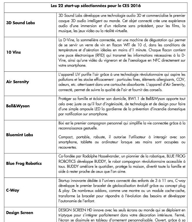 Sommelière connectée, radiateur numérique, véhicule électrique sur mesure, cosmétique ultrapersonnalisée… Telles sont quelques-unes des innovations "made in France" qui feront le show sur le French Tech Pavilion du CES ...de Las Vegas qui se tiendra du 6 au 9 janvier 2016 à Las Vegas. Business France, l’Agence nationale au service de l’internationalisation de l’économie française, a dévoilé le 20 octobre les 22 start-up sélectionnées pour prendre part à sa délégation sur le salon mondial de référence de l'électronique grand public. Ces jeunes pousses sélectionnées sur concours, dont nous vous donnons la liste complète ci-dessous et dont plusieurs ont fait l'objet d'articles sur le site de L'Embarqué, seront l’un des piliers incontournables de la présence française sur le CES.