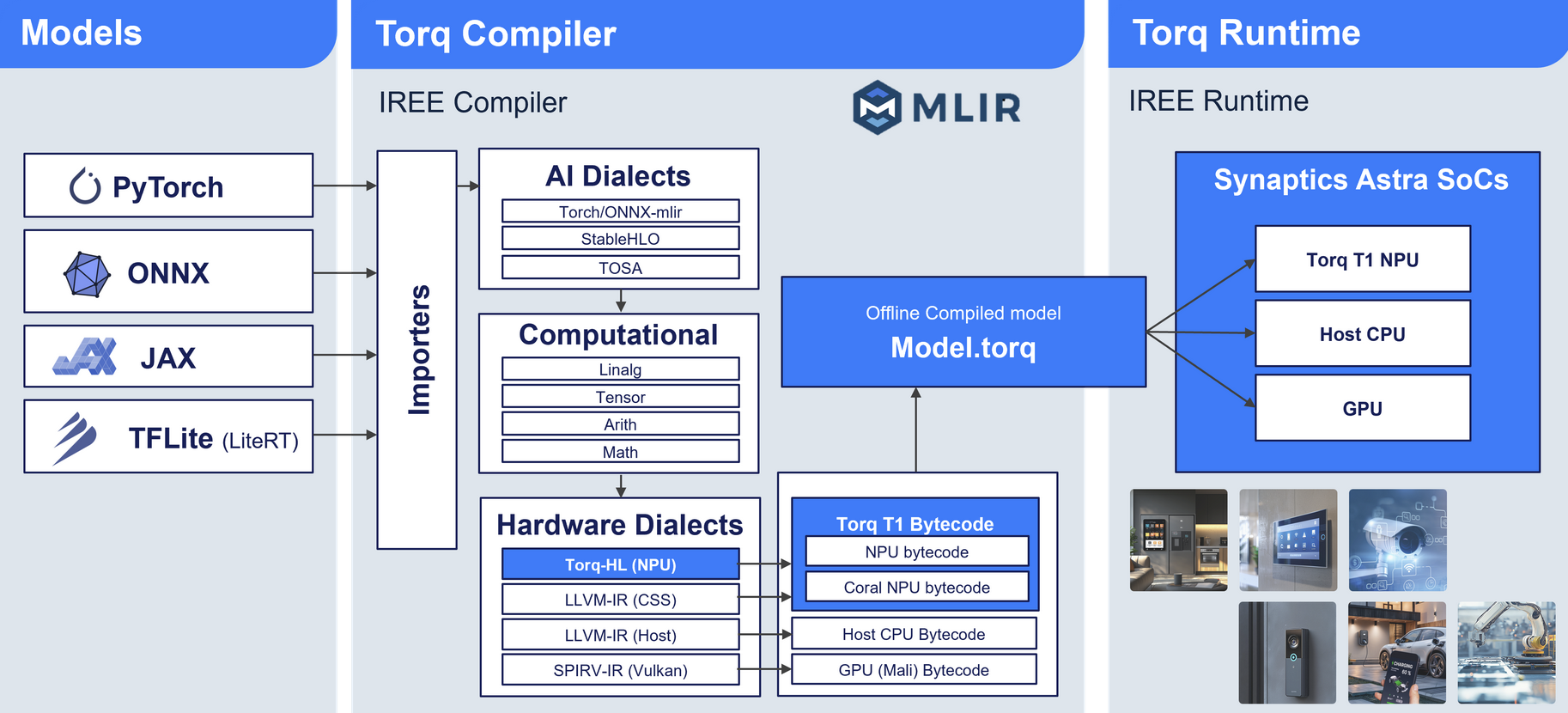 Avec en appui un compilateur et un environnement d'exécution IREE/MLIR (Intermediate Representation Execution Environment, prononcer “eerie”/Multi-Level Intermediate Representation) en open source qui incarne, selon Synaptics, la volonté de la société de proposer une architecture matérielle résolument tournée vers les développeurs.