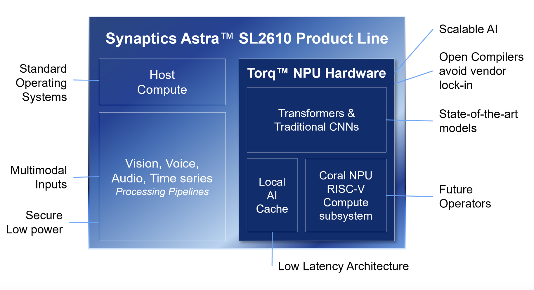 D’un point de vue architectural, une des innovations avancées par Synaptics sur ces circuits est l’introduction au sein de sa plateforme Torq Edge AI du coeur de calcul neuronal (NPU, Neural Processor Unit) en open source Coral de Google, fondé sur un coeur RISC-V.