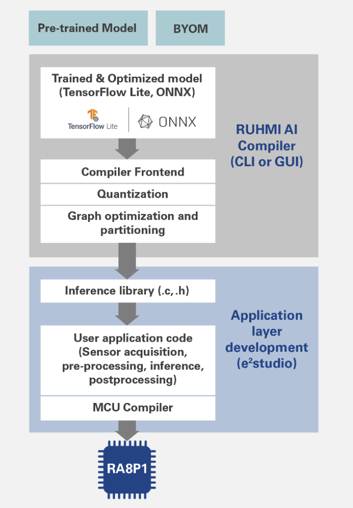 Enfin, à l’occasion de la sortie de ses microcontrôleurs RA8P1, Renesas introduit l’environnement logiciel Ruhmi (Renesas Unified Heterogenous Model Integration), un cadre complet commun aux architectures de microcontrôeurs et de processeurs qui autorise un déploiement des modèles de réseaux neuronaux. Il permet l'optimisation des modèles, la quantification, la compilation et la conversion des graphes, et génère un code source optimisé.