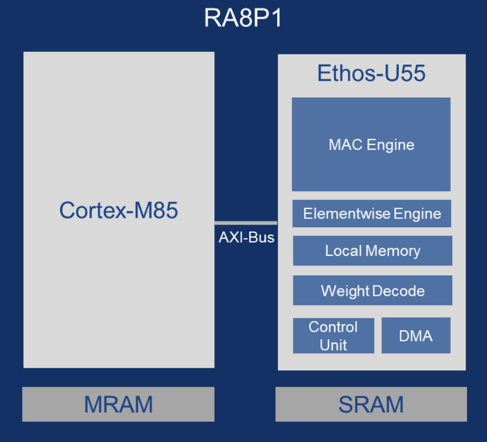 Conçu pour les applications d’IA en périphérie de réseau (Edge), le RA8P1 utilise l’unité neuronale NPU Ethos-U55 pour décharger le processeur des opérations de calcul intensif dans les réseaux neuronaux convolutifs et récurrents (CNN, Convolutional Neural Network et RNN, Recurrent Neural Networks) et fournir une performance de 256 GOPS à 500 MHz.