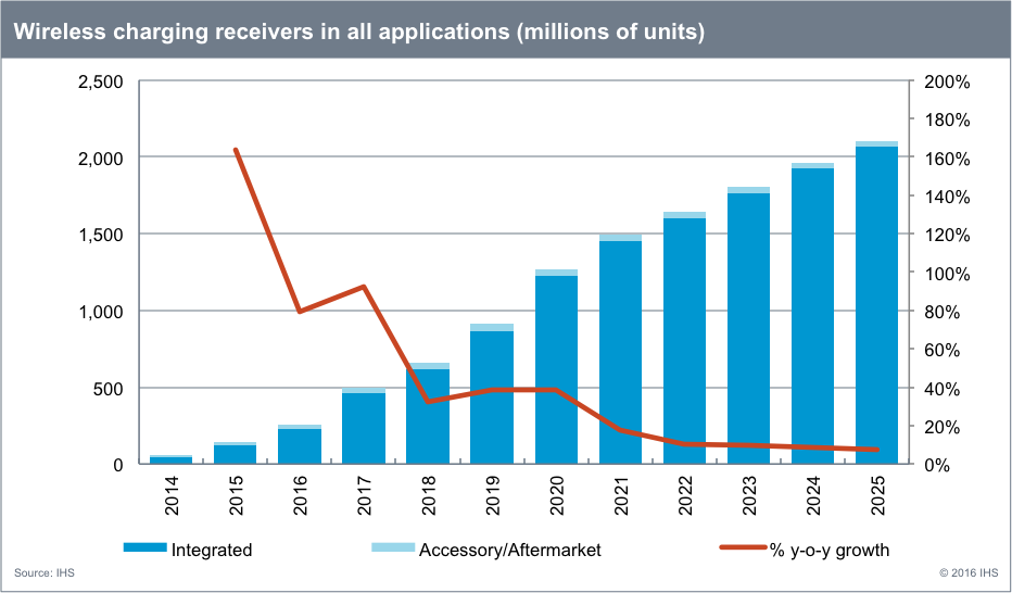 Selon la société d’études IHS, les ventes de modules de réception pour recharge sans fil ont progressé de plus de 160% en 2015 pour atteindre les 144 millions d’unités. La barre du milliard d’unités commercialisées par an ...devrait toutefois être franchie d’ici à 2020 et les ventes devraient venir taquiner les deux milliards d’unités en 2025. Bien évidemment, le marché de la téléphonie mobile reste le principal consommateur de systèmes de recharge sans fil, emmené par la gamme de smartphones Samsung Galaxy dont le dernier modèle, le S7, s’avère compatible avec les standards Qi et PMA (Power Matters Alliance). Selon IHS, 10% des smartphones vendus cette année pourront ainsi être rechargés sans fil.