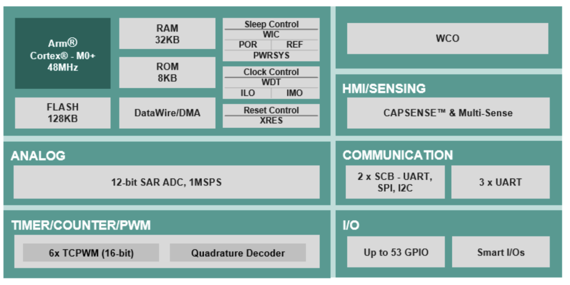 Ce microcontrôleur à coeur Arm Cortex-M0+ cadencé à 48 MHz qui fait parti de la famille des circuits PSoC de la société (issu des activités Cypress racheté par Infineon en 2019) procure aux développeurs outre une combinaison de blocs analogiques et numériques, 128 Ko de mémoire flash et 32 Ko de mémoire Sram ainsi qu’un convertisseur analogique/numérique sur 12 bits doté d’une vitesse d’acquisition de un mega échantillons/s.