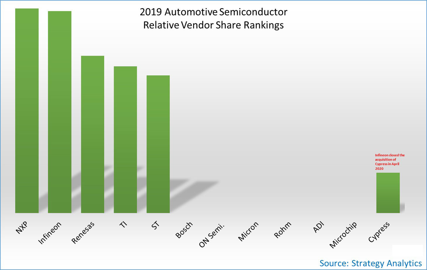 « Une refonte majeure du classement des sociétés de semi-conducteurs pour l’automobile est prévue à terme, prévient Asif Anwar de Strategy Analytics. En 2019, Infineon a annoncé avoir conclu un accord définitif pour l’acquisition de Cypress, un rachat qui a été finalisé en avril 2020 et qui va propulser Infineon à la première place. »