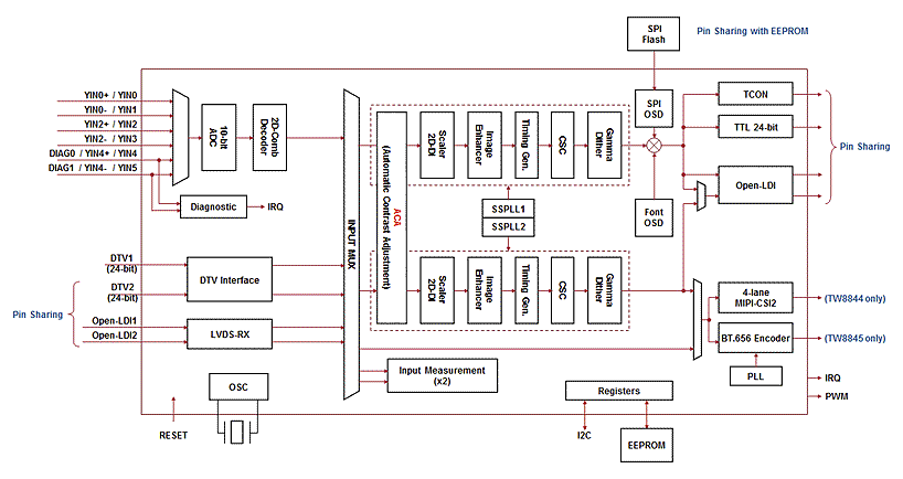 Le circuit prend en charge les entrées vidéo composites différentielles, pseudo-différentielles et à simple extrémité (deux différentielles ou quatre à simple extrémité), deux ports d'entrée RGB numériques indépendants (RVB 24 bits à 160 MHz), deux ports d'entrée LVDS OpenLDI, une entrée Full HD (1080p) ou deux entrées HD (720p chacune).