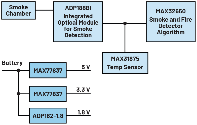 La théorie et la simulation, c’est important. Mais la situation peut être différente avec du matériel réel. En plus des cartes d’évaluation associées aux différents convertisseurs, des systèmes de capteur pratiques et complets sont également disponibles, tels que le détecteur de fumée “Multistandard Micropower Verified Smoke Detection System-on-Module” où le circuit MAX77837 et le régulateur ADP162 font fonctionner un détecteur de fumée complet composé du module optique intégré ADPD188BI pour la détection de fumée, en association avec le microcontrôleur MAX32660 doté de son algorithme de détection de fumée et d’incendie exécuté sur un coeur ARM Cortex-M4 et le capteur de température numérique MAX31875. Tous les fichiers de conception sont téléchargeables sur le web. Ils facilitent la création de capteurs pour maisons intelligentes de qualité élevée dotés de fonctionnalités nano-puissance. Ce capteur optimisé et vérifié inclut le logiciel nécessaire et démontre les capacités des circuits de gestion de puissance.