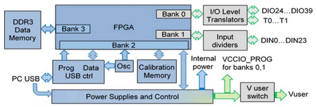 L’instrument Digital Discovery, orchestré par un FPGA, en l’occurrence ici un Spartan-6 de Xilinx (modèle XC6SLX25-2), est alimenté via le port USB de l'ordinateur auquel il est connecté.