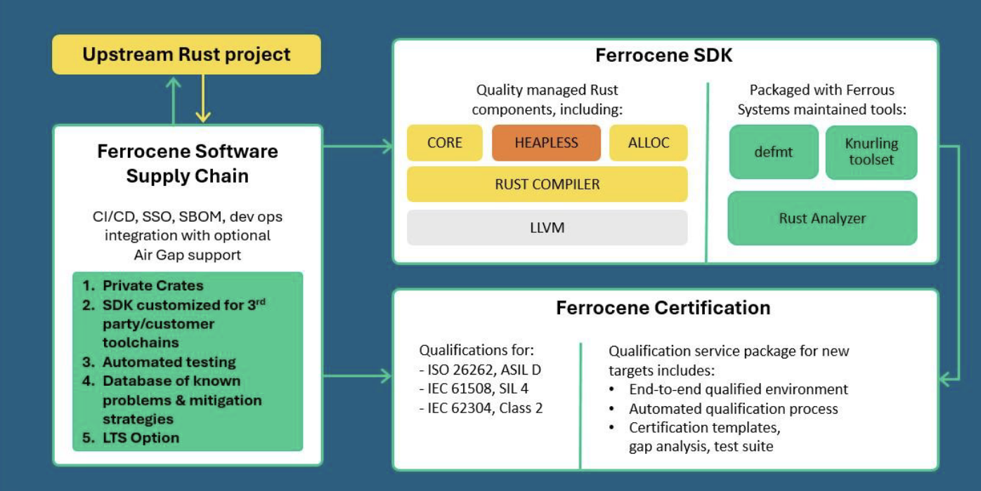 Pour rappel, Ferrous avait précédemment obtenu ces dernières années la qualification de sa chaîne d'outils y compris le compilateur selon les normes ISO 26262 ASIL D pour l’automobile (pour une fraction de la bibliothèque), IEC 61508  SIL 2 pour l'industrire et IEC 62304, Classe C, pour le mdédical, et ce pour des sous-ensemble de la bibliothèque du noyau Rust.