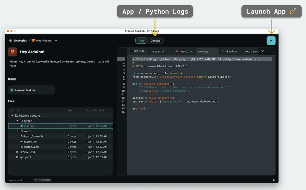 Parallèlement, Arduino a présenté App Lab, un nouvel environnement de développement intégré (IDE) qui propose aux développeurs une plateforme en open source (sous licence GPL 3.0) conçue pour concevoir, prototyper et industrialiser rapidement des solutions fondées sur l’IA. Son intégration fluide avec la plateforme Edge Impulse permet également, selon Qualcomm et Arduino, d’accélérer la création, l’ajustement et l’optimisation de modèles d’IA utilisant des données réelles, pour des applications telles que la détection d’objets/personnes, la détection d’anomalies, la classification d’images, la reconnaissance sonore ambiante et la détection de mots-clés et de mots de réveil (wake words).