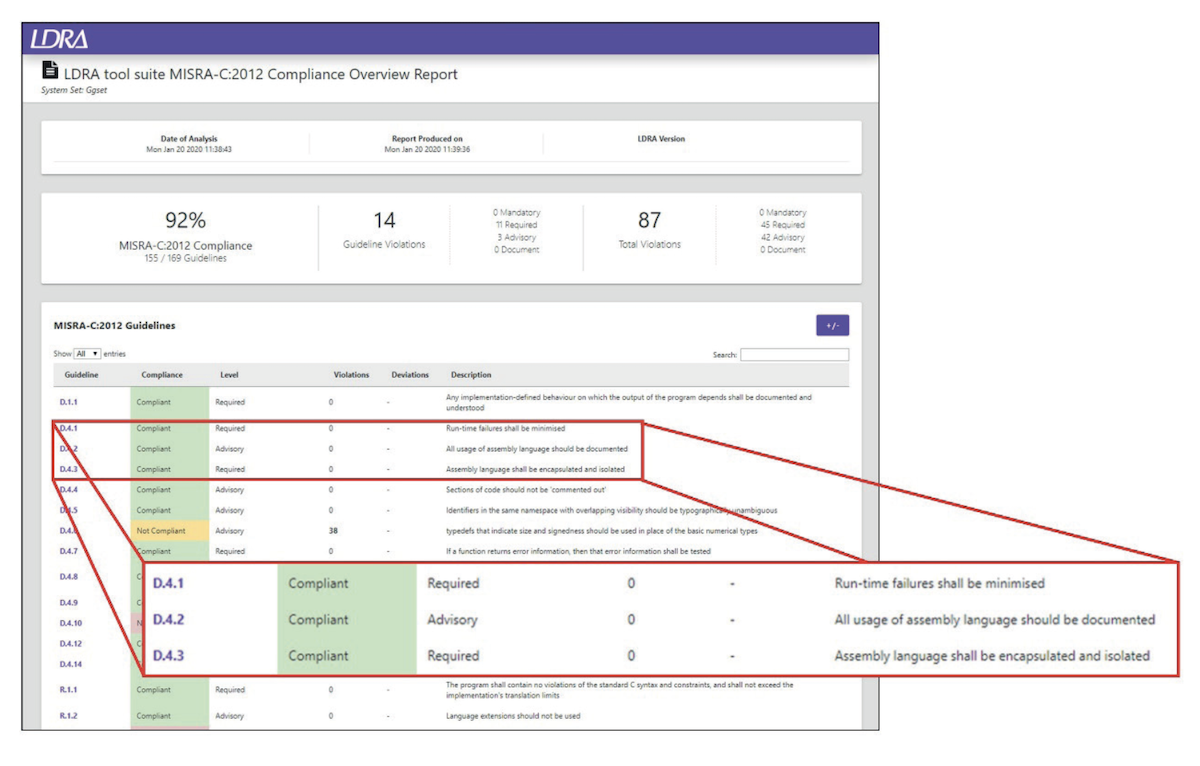 Les directives Misra C recommandent d'utiliser des outils d'analyse statique pour valider le code par rapport à ses règles et directives. A ce titre, outre la prise en charge de toutes les versions des directives Misra, la suite d'outils LDRA utilise une analyse statique pour identifier les zones de code non conforme afin de faciliter la documentation et les modifications à réaliser.