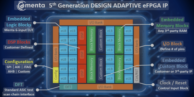 L’IP de l’eFPGA de Menta peut aussi intégrer des macros matérielles telles que des blocs de mémoire RAM ou de DSP issues de tierces parties, et brevetées Menta.