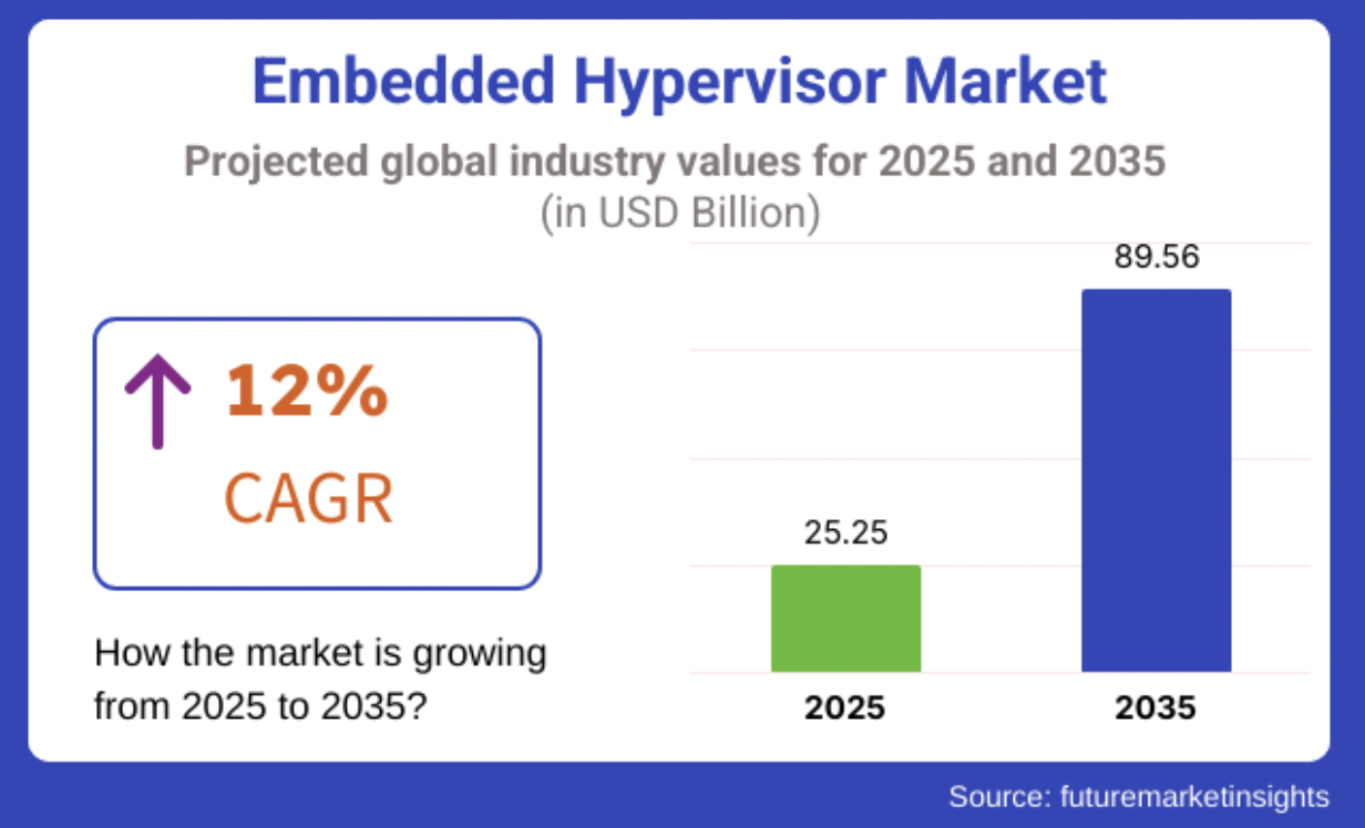 Le marché des hyperviseurs embarqués passerait de 25,25 Md$ en 2025 à 89,56 Md$ en 2035