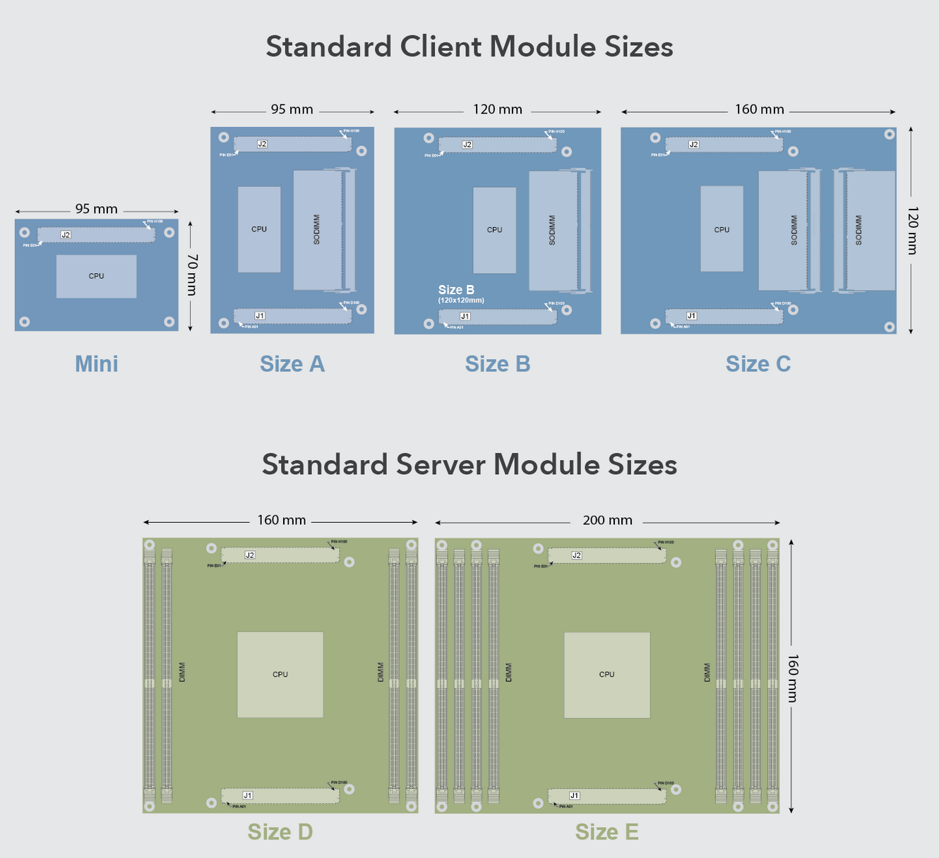 La spécification, afin de satisfaire divers besoins émergents, notamment au niveau de l’alimentation et des capacités d’extension, définit deux classes de modules COM-HPC - Client et Serveur - et cinq dimensions physiques différentes - A, B et C pour les modèles COM-HPC Client ; D et E pour les modèles COM-HPC Server - ainsi qu’une connectique commune pour les liaisons avec une carte porteuse (avec 800 broches réparties sur deux connecteurs de 400 broches).