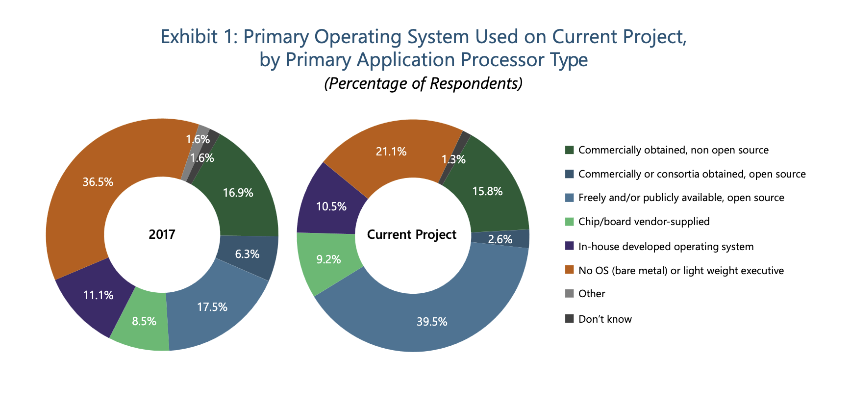 VDC indique qu’à ce niveau, les développeurs de systèmes embarqués sont de plus en plus disposés à adopter des systèmes d'exploitation en open source à mesure que ces plateformes gagnent en maturité en termes de capacités critiques de sécurité et que, parallèlement, les budgets se resserrent.