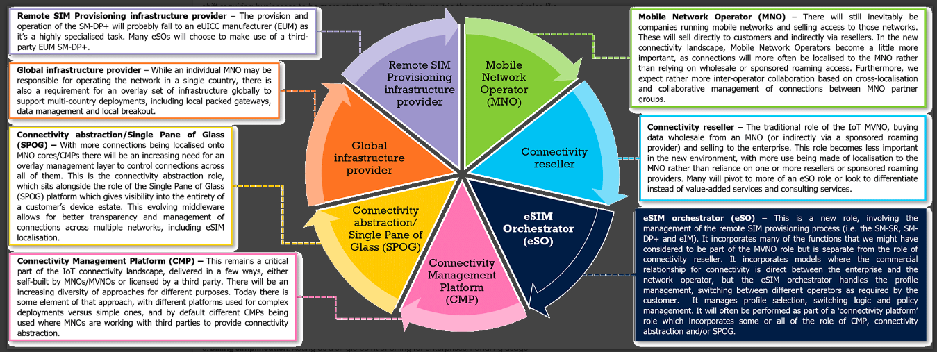 Au-delà, toujours selon Transforma Insight, cette fonction devra aussi prendre en compte les capacités et les exigences de certification des appareils IoT eux-mêmes, y compris les contraintes de puissance, lors de la gestion des profils eSIM, assurer la facturation unique pour les entreprises, gérer la vérification et le rapprochement des données d'utilisation entre plusieurs opérateurs de téléphonie mobile, fournir un support client mondial unifié et enfin entretenir une relations de confiance avec les opérateurs de téléphonie mobile.