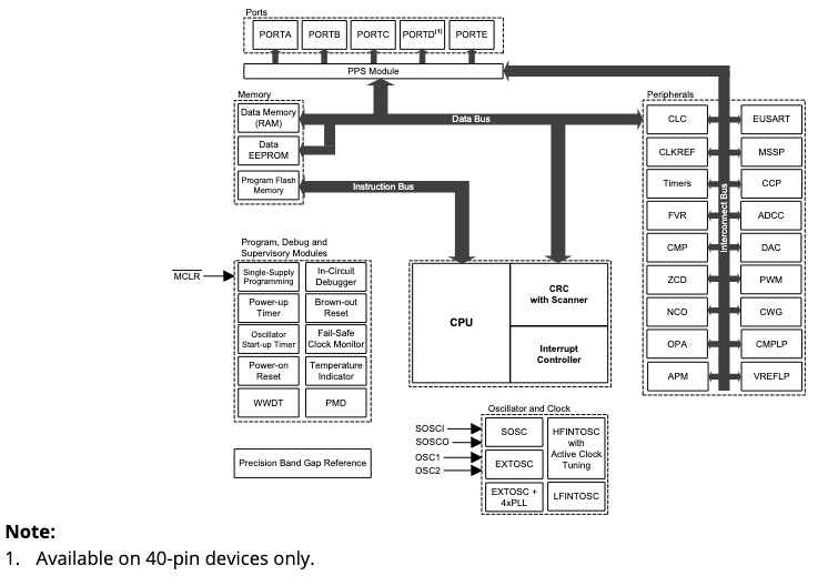 Au sein de cette architecture, le gestionnaire de périphériques analogiques intégré au circuit (l'APM, Analog Peripheral Manager), contrôle les périphériques actifs en vue, selon Microchip, de minimiser la consommation d'énergie totale et de permettre aux applications fonctionnant sur batterie de surveiller efficacement les signaux sans consommation excessive.