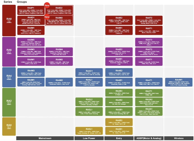 Le microcontrôleur RA8M2, quant à lui, cible les systèmes IoT et de contrôle industriel hautes performances à usage général, sans interface, avec des capacités de mise en réseau et de calcul avancé grâce au coeur Cortex-M85.