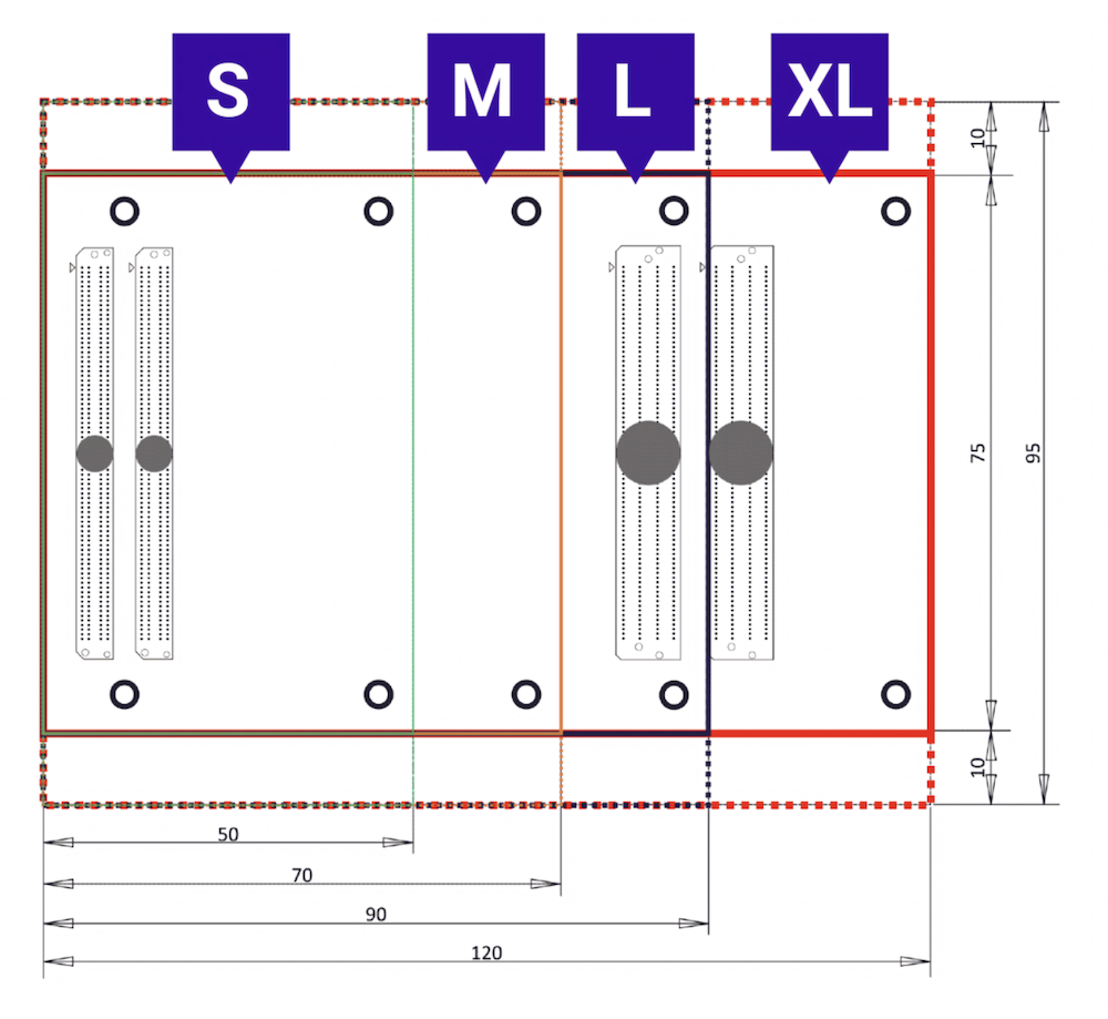 Alors que les modules de taille S peuvent être implantées en taille S1 (avec un seul connecteur) ou en taille S (avec deux connecteurs), les modules de taille M conservent la même configuration de connecteurs que les modules de taille S, tout en offrant une surface de circuit imprimé accrue pour le placement des composants. Les modules SoM de taille L et XL étendent la surface du SoM et le nombre de connecteurs pour prendre en charge respectivement jusqu’à 3 et 4 connecteurs.