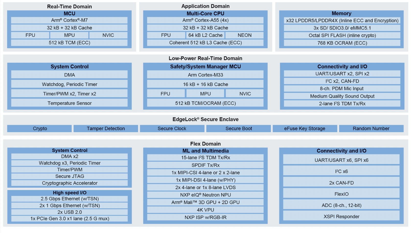 Au-delà, le circuit intègre jusqu'à quatre cœurs Arm Cortex-A55 associé à un domaine de sécurité indépendant composé de coeurs Arm Cortex-M7 et Cortex-M33.