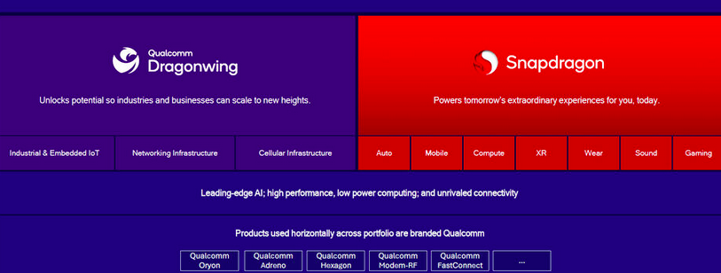 Dragonwing regroupe désormais les solutions d'infrastructure (cellulaires et réseau) et tout ce qui touche à l'IoT industriel. C’est-à-dire toutes les solutions qui visent la robotique en usine, les caméras et autres systèmes de vision, les drones, la 5G industrielle et les systèmes informatiques d'edge computing pour faire de l'IA générative sur site. On notera que les solutions de Qualcomm pour le marché automobile (connectivité, infodivertissement, conduite autonome) resteront sous la marque Snapdragon.