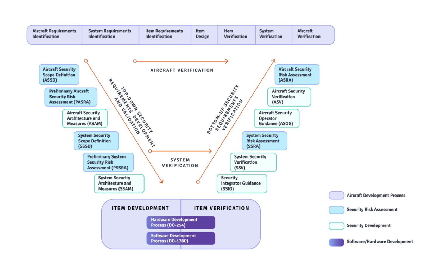 Dans la figure ci-dessous, le processus de sécurité décrit dans la norme DO-326B est par exemple aligné sur le processus de développement aéronautique décrit dans la norme ARP4754B, illustrant comment les développeurs peuvent suivre un processus hybride de sûreté et de sécurité pour satisfaire aux deux normes.