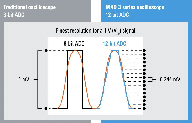 Ces appareils MXO 3 affichent une résolution verticale matérielle de 12 bits quelle que soit la fréquence d'échantillonnage, ce qui permet d'observer les faibles variations du signal analysé. Et ce qui amène à une résolution 16 fois supérieure à celle des oscilloscopes 8 bits traditionnels.