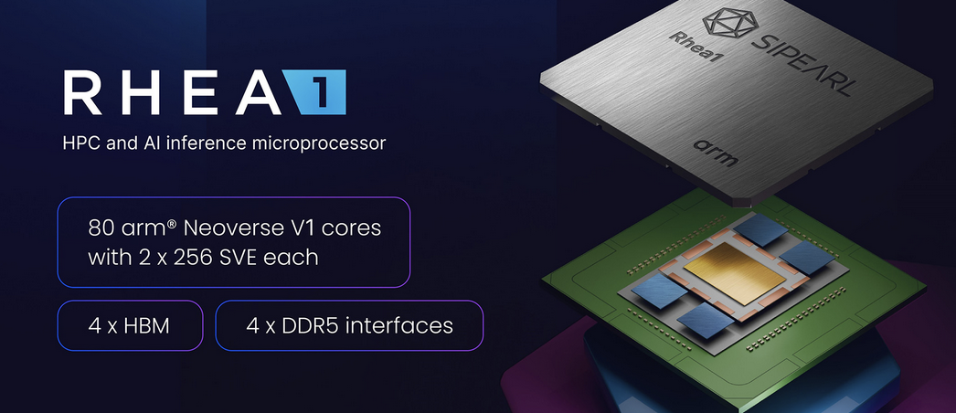 Ainsi le Rhea1, en cours de conception, intégrera 80 coeurs Arm Neoverse V1 avec deux unités dites SVE (Scalable Vector Extension pour extension vectorielle évolutive) de 256 bits par cœur. On y trouvera aussi quatre piles de mémoire à large bande passante HBM (High Bandwidth Memory) embarquées d'origine Samsung et quatre interfaces pour des mémoires DDR5 capables de prendre en charge deux mémoires DIMM par canal, à quoi s’ajoutent jusqu’à 104 voies d'interface PCIe Gen5.