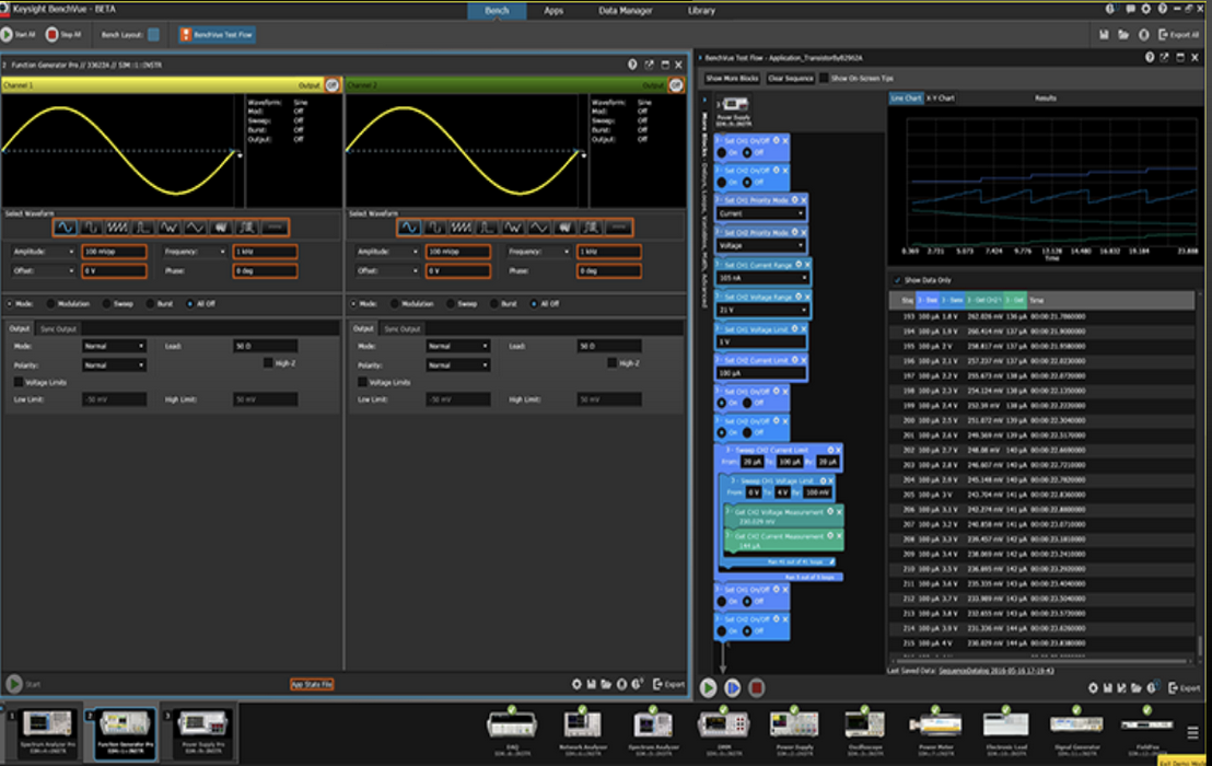 Pour le contrôle de l’ensemble de ces quatre instruments, le logiciel PathWave BenchVue Software de Keysight, permet de configurer les commandes et les mesures depuis un PC. Avec la possilbité de créer des séquences de tests, de contrôler intuitivement les instruments, d’automatiser les tests et d’effectuer des analyses des mesures, est ce sans programmation, uniquement à travers des fonctions de type glisser/déposer avec la souris.