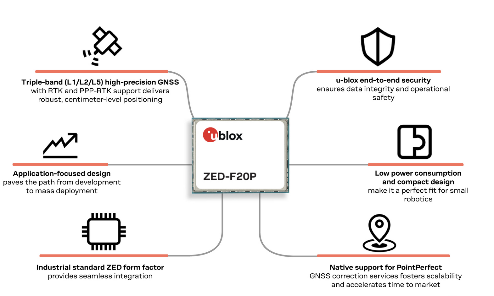 En proposant le circuit de positionnement à partir de signaux satellites ZED-F20P triple bande, la société suisse u-blox, fournisseur de technologies et de services de positionnement et de communication radio, apporte aux équipementiers déployant des flottes de robots terrestres, de drones et autres plateformes autonomes dynamiques une précision de localisation centimétrique RTK et PPP-RTK (*), des temps de convergence rapides et des fonctionnalités de démarrage sécurisé (secure boot) et d'authentification de messages intégrée (OSNMA, Open Service Navigation Message Authentication).