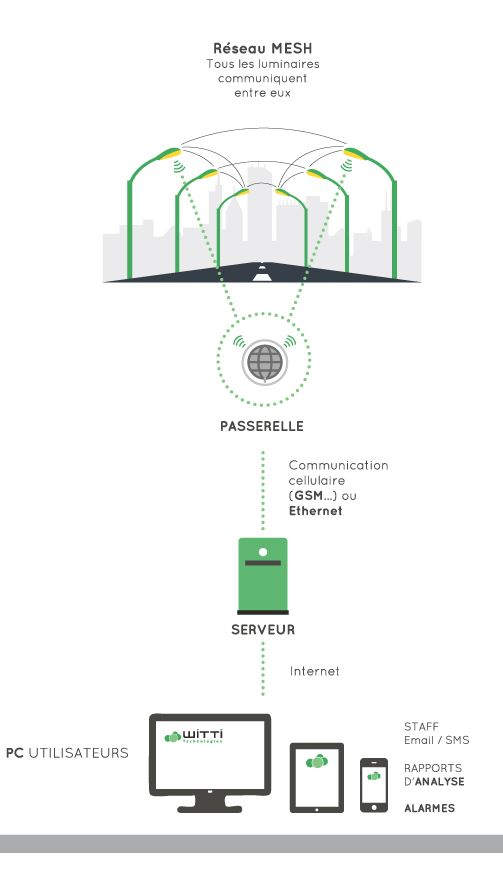 C’est justement sur ce marché que se positionne aujourd’hui la jeune société française Witti, créée en juin 2017 et spécialisée dans l'éclairage intelligent pour les villes et l'industrie. « Depuis 2016, nous avons développé une offre complète de supervision et de contrôle de l'éclairage public qui repose sur un réseau de communication sans fil utilisant le protocole Wirepas Mesh, détaille Frédéric Guinard, cofondateur (avec Jérôme Reboul) et directeur général de la start-up dont le siège est basé à Loos-en-Gohelle (62), tout près de Lens. Nous sommes partenaires depuis le départ de la société finlandaise Wirepas dont la technologie nous a semblé pertinente à plusieurs point de vue et qui fonctionne d’autant mieux que le réseau est dense, ce qui est le cas dans les milieux urbains. »