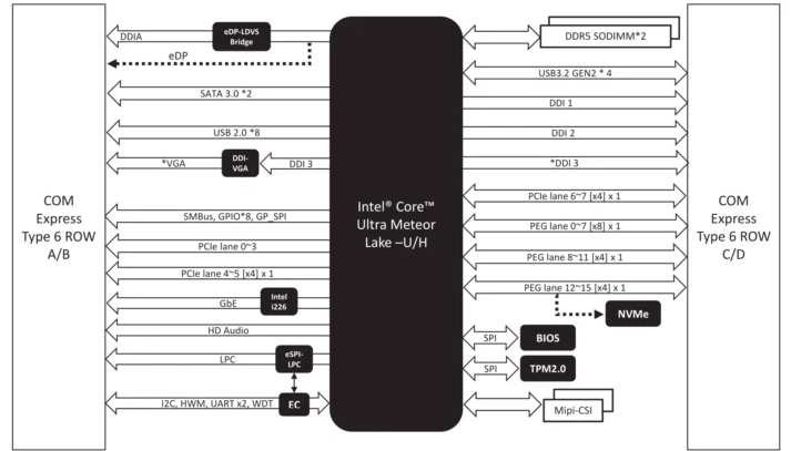 Le COM-MTHC6 est le premier ordinateur sur module d’Aaeon à utiliser la plateforme Intel des Core Ultra. C’est également, selon la société, le premier module COM Express Type 6 Compact du marché à être équipé, au-delà des  Core Ultra 7 155H ou Core Ultra 5 125H, du processeur à 45 W Intel Core Ultra 9 185H à 16 cœurs et 22 threads.