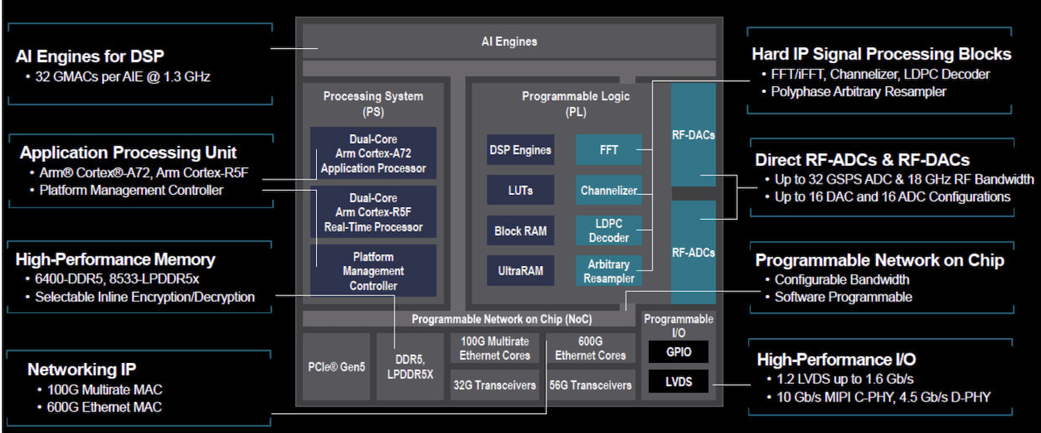 Au-delà de ces blocs fixes, les moteurs d'IA et des moteurs DSP spécifiques (DSP58) fournissent des ressources programmables supplémentaires pour les chaînes de signaux adaptatives et les charges de travail imprévues.