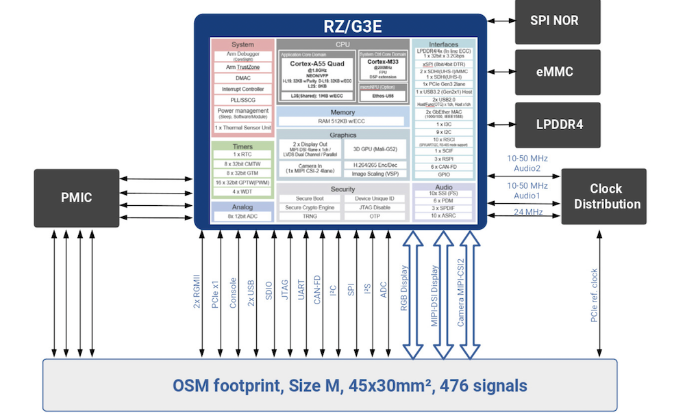 En termes de support logiciel, le SiP MSRZG3E fonctionne avec un BSP (Board Support Package) Linux fondé sur le projet Yocto, procurant une prise en charge complète des graphiques, du multimédia et de la connectivité, tandis que le cœur Cortex-M33 intégré peut gérer un système d’exploitation en open source FreeRTOS, Zephyr ou des tâches bare-metal pour un contrôle en temps réel.
