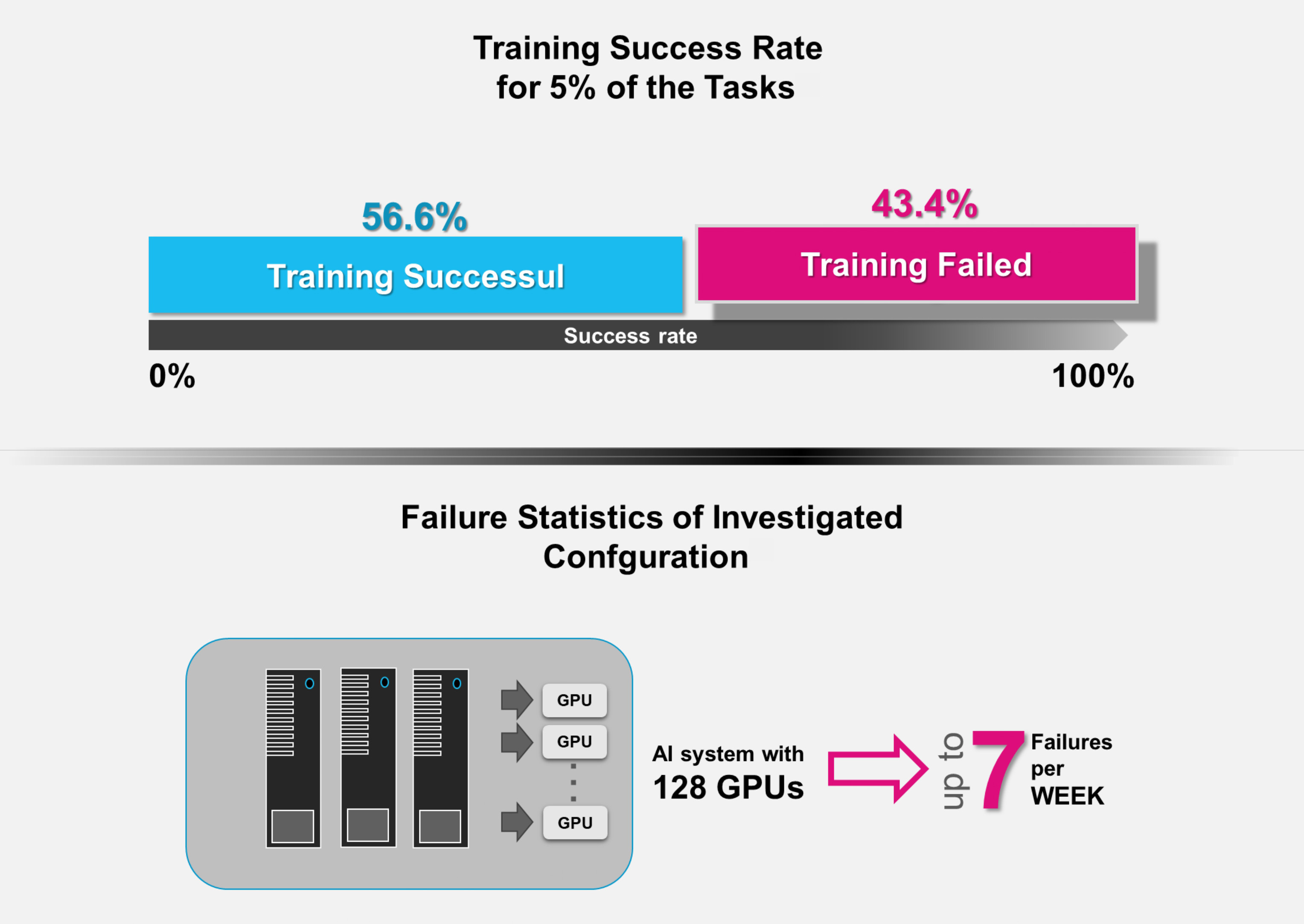 Les défaillances sont fréquentes dans des infrastructures complexes avec de longs cycles d’entraînement. Les études montrent des taux de défaillance significatifs. Par exemple, jusqu’à 43,4 % pour les tâches les plus gourmandes en ressources, jusqu’à sept par semaine avec 128 GPU (***).