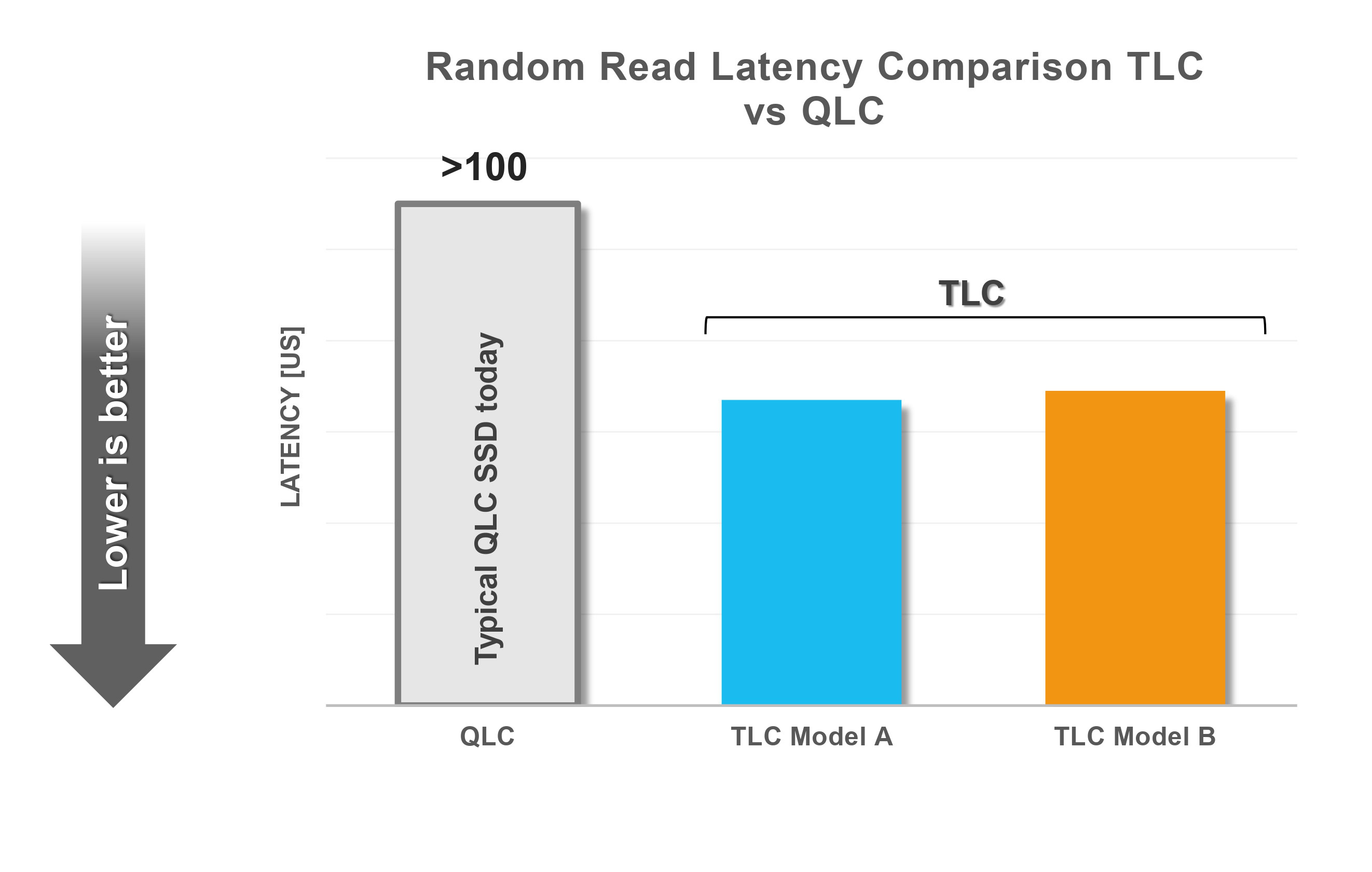 Alors que les disques QLC répondent aux besoins nécessitant des capacités extrêmement importantes, les disques TLC jouent un rôle important dans les cas d’utilisation nécessitant une faible latence Les disques QLC existants ont des latences plus élevées que les TLC équivalents.