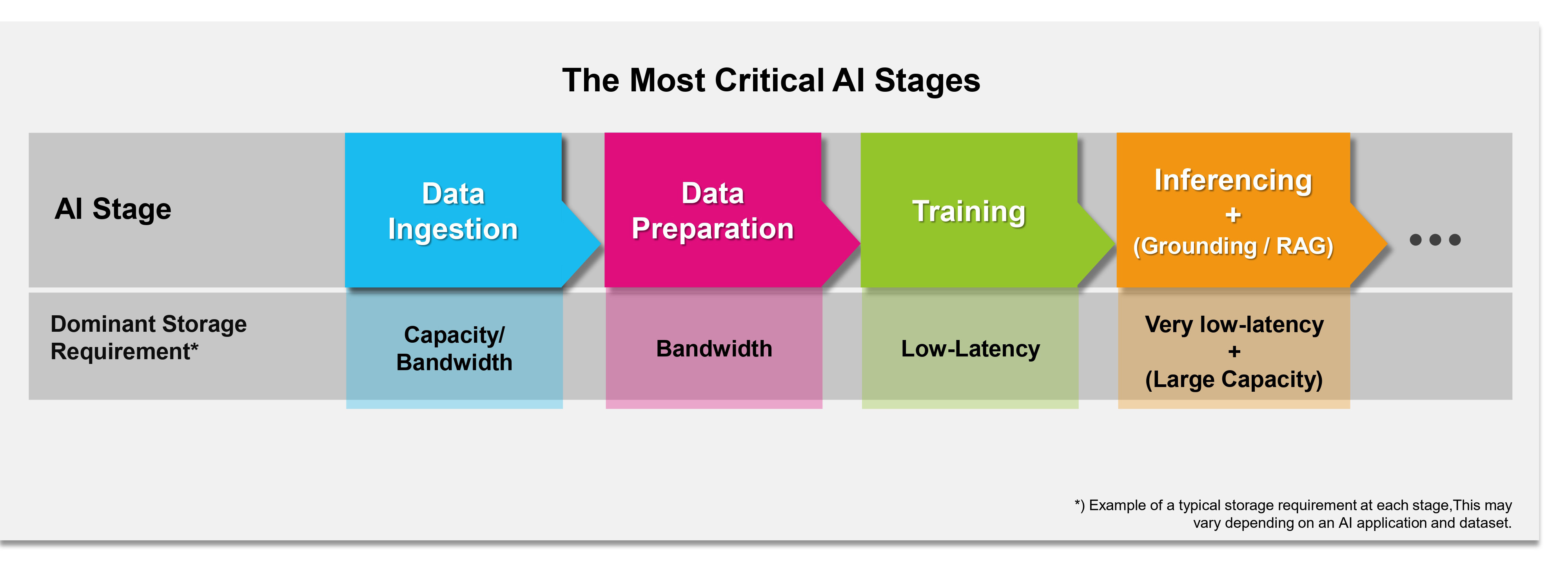 Si le maintien d’une efficacité d’entraînement élevée et d’une infrastructure à base de GPU pleinement exploitée constitue un défi majeur, les exigences en matière de stockage de données par IA sont plus larges. Le cycle de traitement des données par l’IA dans les serveurs d’entreprise modernes comprend plusieurs étapes critiques du point de vue du stockage : l’ingestion de données, la préparation des données, l’entraînement de l’IA et l’inférence d’IA.