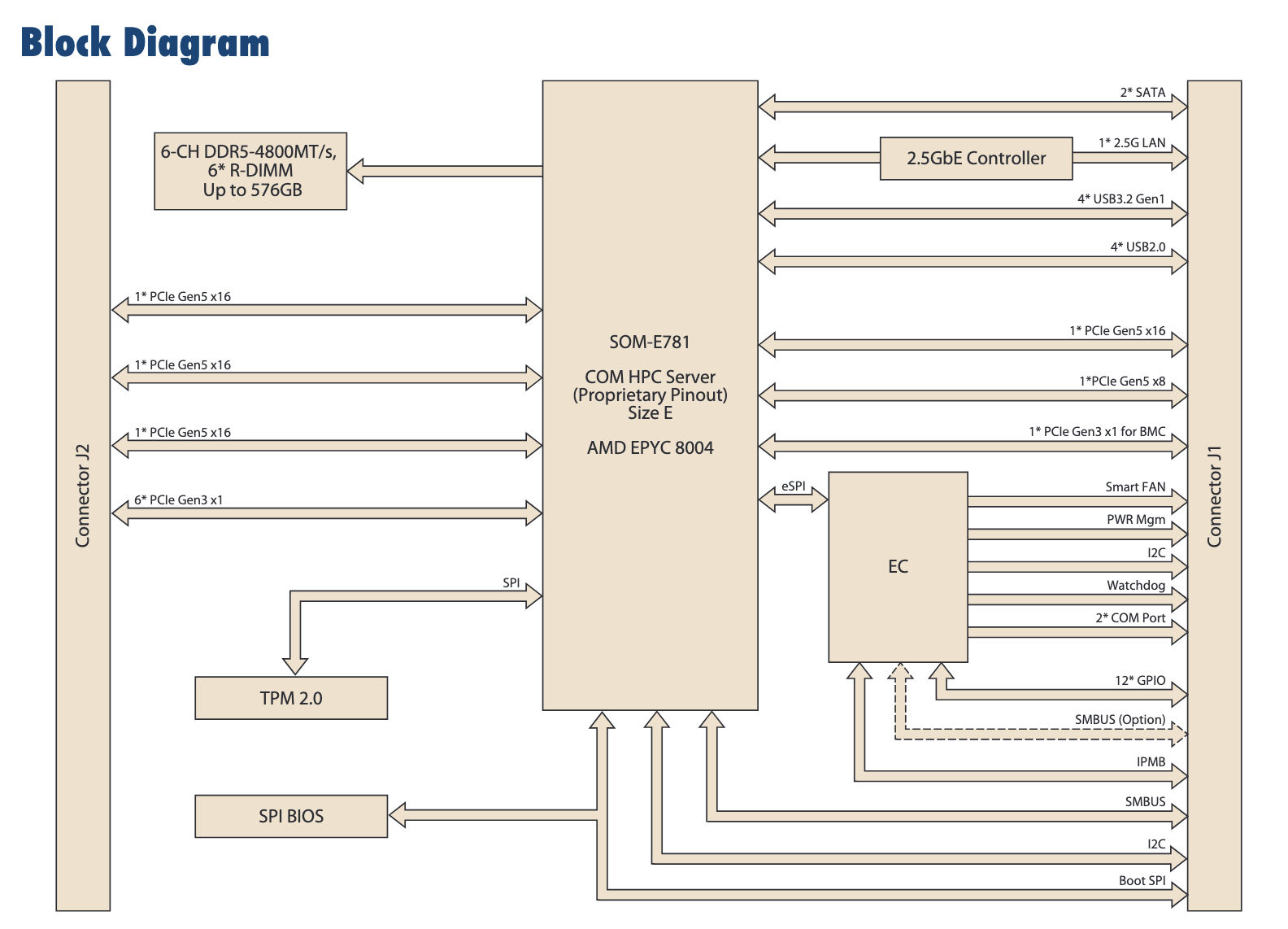 Par rapport au COM-HPC Server de taille E standard, le SOM-E781 augmente le nombre de voies PCIe de 64 à 79 avec un brochage optimisé, proposant ainsi, selon Advantech, le plus grand nombre de voies PCIe disponible sur le marché.
