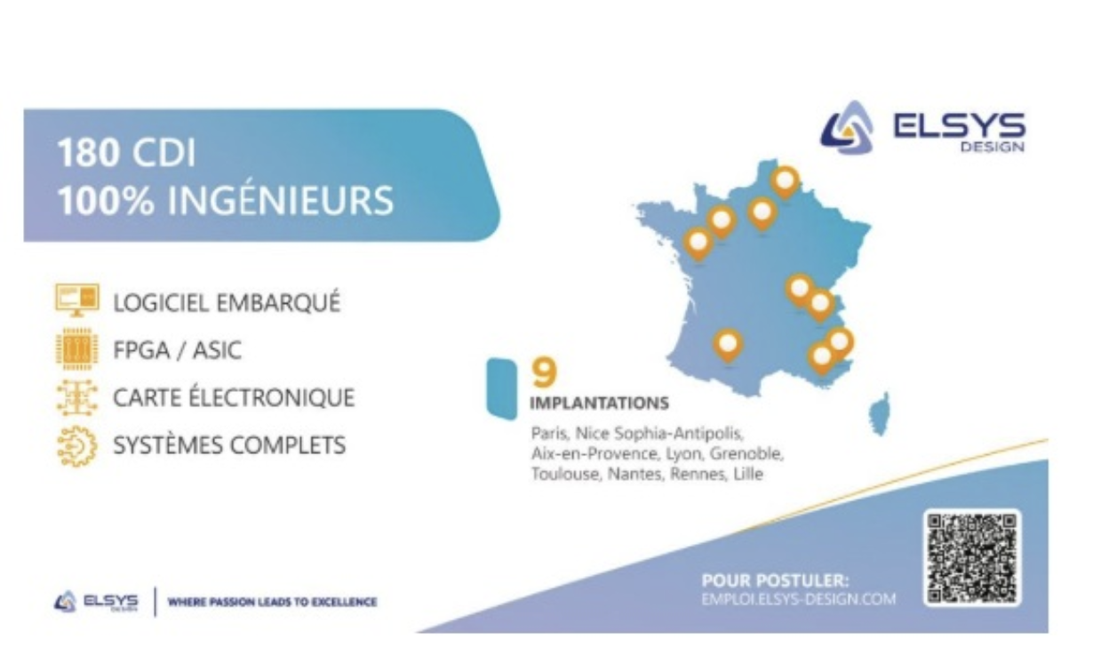 Elsys Design, spécialisée dans la conception des systèmes électroniques embarqués (microélectronique, carte électronique, logiciel embarqué, ingénierie système), prévoit ces recrutements pour ses implantations de Paris, Lille, Lyon, Grenoble, Nice Sophia-Antipolis, Aix-en-Provence, Toulouse, Nantes et Rennes.