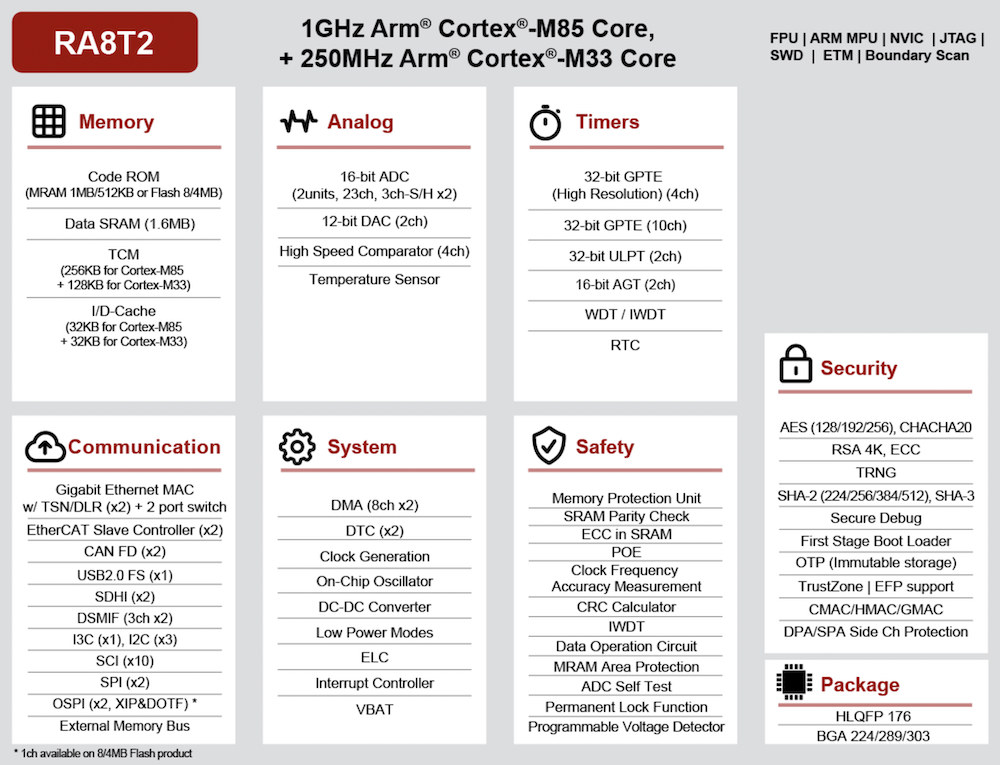Le circuit RA8T2 toujours fondé sur un coeur de processeur Arm Cortex-M85 cadencé à 1 GHz,  avec en sus un processeur Arm Cortex-M33 à 250 MHz en option, délivre un niveau de performance élevé pour le contrôle en temps réel de moteurs haut de gamme dans les équipements industriels, les robots et autres systèmes nécessitant un fonctionnement précis à très grande vitesse.