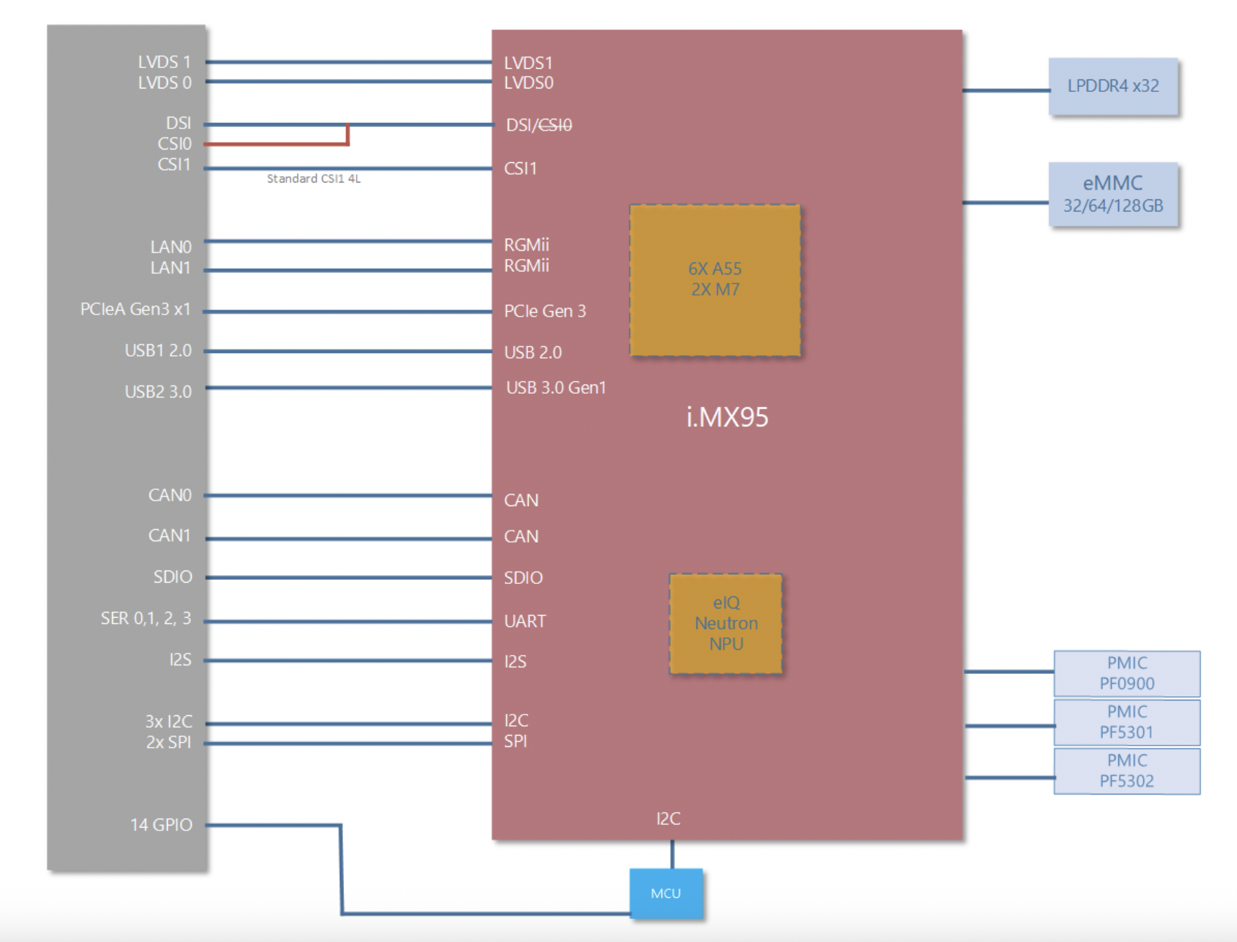 Auxquels s’ajoutent un accélérateur neuronal, le Neutron eIQ capable de traiter des données jusqu’à 2 TOPS, une mémoire RAM LPDDR4L allant jusqu'à 16 Go, une mémoire Flash eMMC allant jusqu'à 256 Go et des interfaces haut débit comme l'USB 3.0 et le PCIe Gen3.