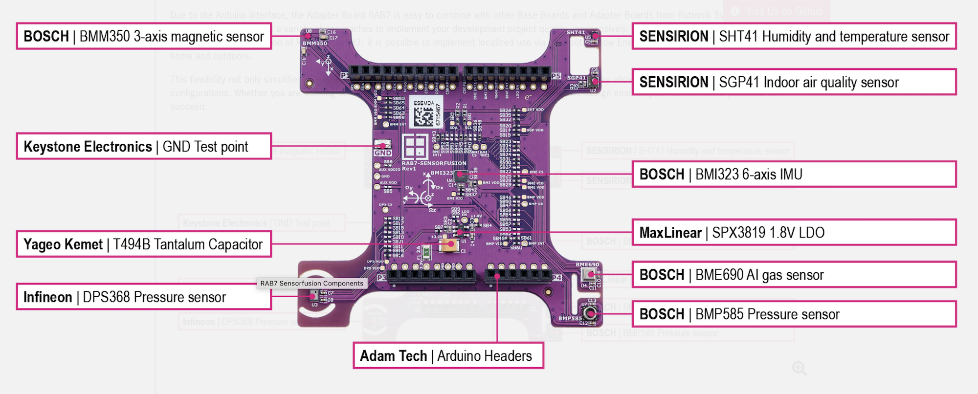 La carte adaptateur RAB7 est alimentée par des connecteurs compatibles Arduino avec une alimentation de 3,3 V et tous les capteurs sont configurés pour fonctionner avec les interfaces I2C et SPI. Chaque capteur peut être déconnecté de l'alimentation et des circuits I2C en dessoudant les ponts de soudure, permettant ainsi d'utiliser uniquement les capteurs nécessaires à une application de fusion de capteurs spécifique.