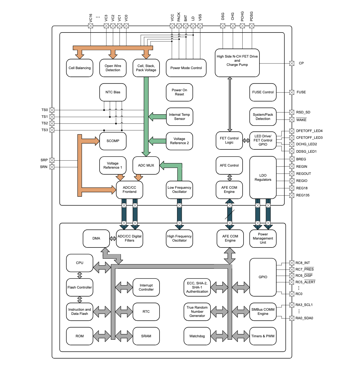 Ces deux gestionnaire de batterie communiquent à travers des interfaces compatibles SMBus ou I2C et combinent un processeur 32 bits ultra-faible consommation, des capacités de mesure analogiques de haute précision, une mémoire flash intégrée, une gamme d’entrées/sorties périphériques, et un répondeur d'authentification SHA-1, SHA-2 ou EC-KCDSA dans une solution de gestion de batterie complète.